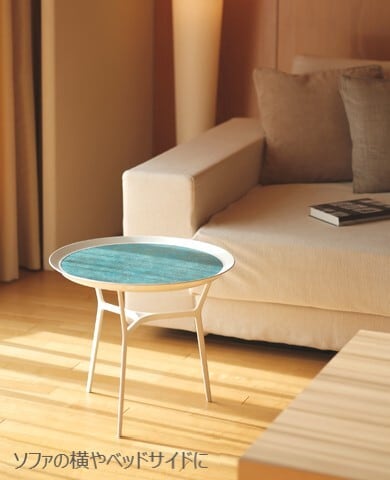 茎葉を思わせるシャープで有機的な脚部と多彩で華やかな表情をみせるトレイ部でできています。インナープレートには朝顔や梅、雛菊といった日本らしい花をモチーフにデザインされ、気分によって変えられます。現代をスタイリッシュに、自由に生きる人々のライフスタイルに溶け込むようなテーブルになっています。